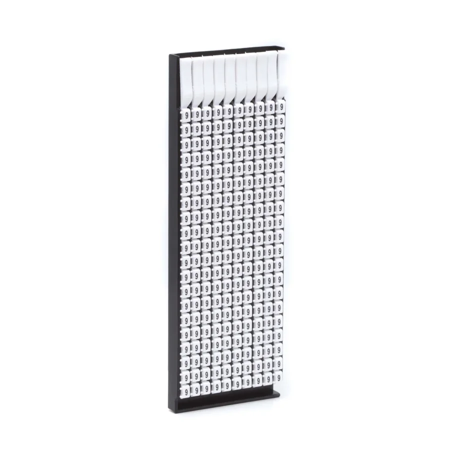 Ручная маркировка системы MARK 3 для маркировки проводов без разъединения электрической цепи из полиамида 6.6. Температура эксплуатации от –30 до +70 °С. Боковые штифты надежно фиксируют соединение друг с другом и позволяют добиться точного выравнивания маркеров. Цвет маркеров соответствует международной кодировке. Символ "9" черного цвета на белом маркере для сечения провода 1.5-2.5 мм2. В упаковке 200 маркеров.