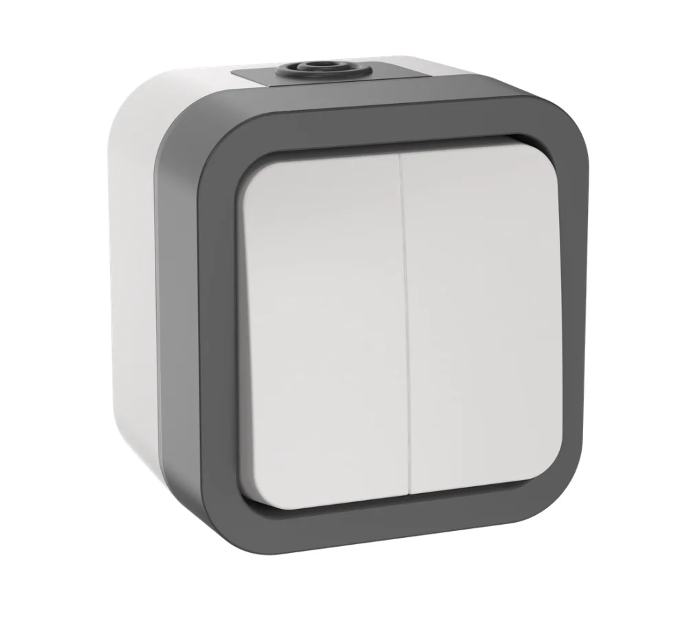 TORS Выключатель двухклавишный 10А IP55 TS205 серо-белый IEK TS-V20-0-10-55-K41
