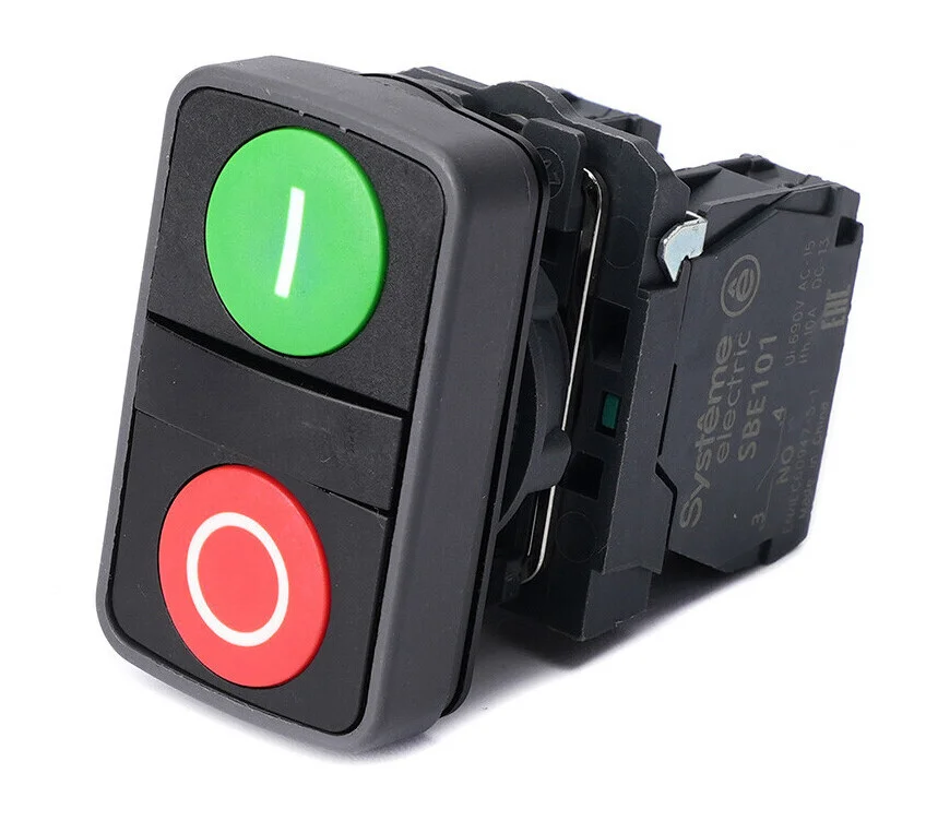 Кнопка двойн SB5 в сборе модуль 22мм зел "I"+красн "O" пластик 1НО+1НЗ Systeme Electric SB5AA73415
