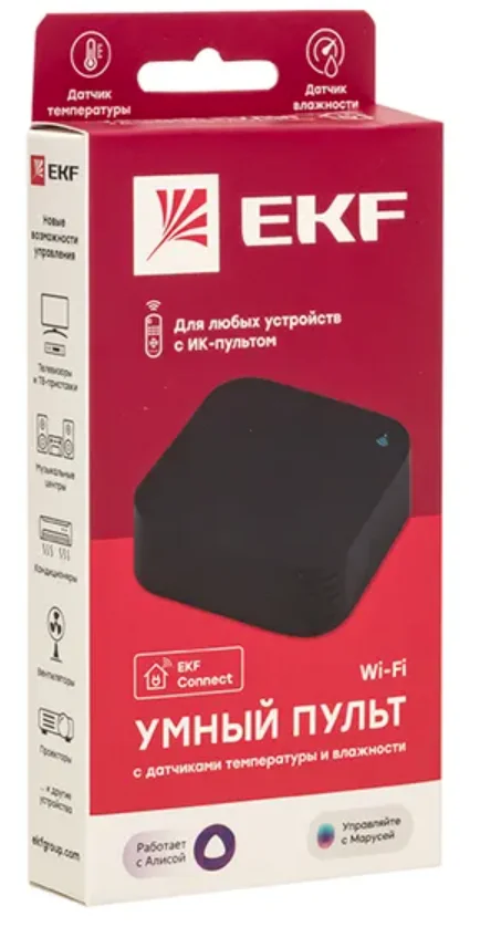Умный пульт EKF Connect позволяет управлять любыми устройствами, у которых есть свой ИК-пульт, через приложение и через голосовые помощники Алису от Яндекса, Марусю от VK и Салют от Сбера. Примеры устройств, которыми можно управлять - кондиционеры, телевизоры, музыкальные центры. В умный пульт встроены датчики температуры и влажности, что позволяет не только видеть эти параметры в приложении EKF Connect Home, но и создавать автоматические сценарии, например, чтобы кондиционер включался, когда температура превышает заданное значение, а умная розетка с увлажнителем включалась, когда влажность становится слишком низкой. Преимущества: Работает с iOS и Android Работает с Алисой, Марусей и Салютом. Режим обучения позволяет подключать даже те модели устройств, которых нет в базе приложения