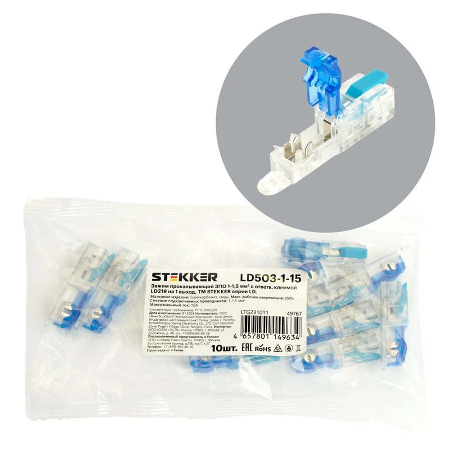 Зажим прокалывающий ответвительный 1-1,5 мм c ответвительной клеммой LD219 на 1 выход, прозрачный/си