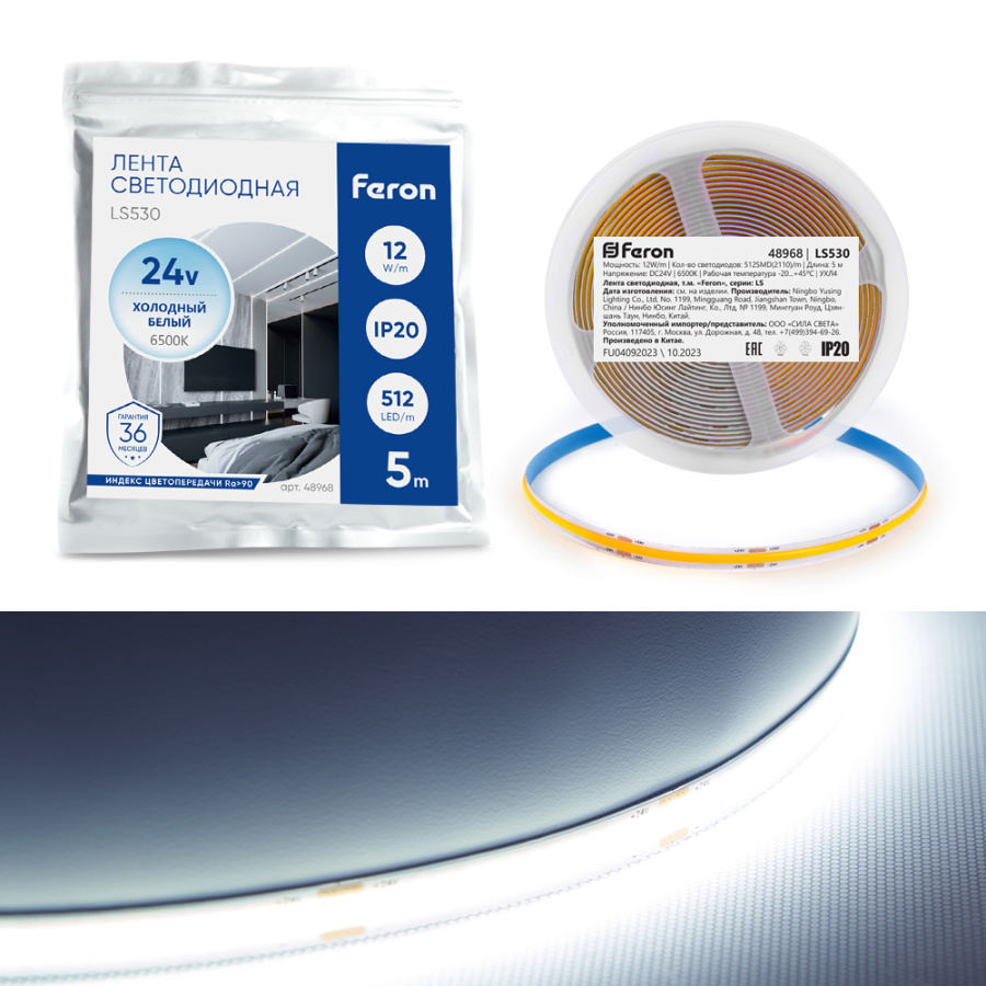 Светодиодная COB лента LS530, 512SMD(2110)/м 12Вт/м 24V 5000*10*1.8мм 6500К IP20 Feron 48968
