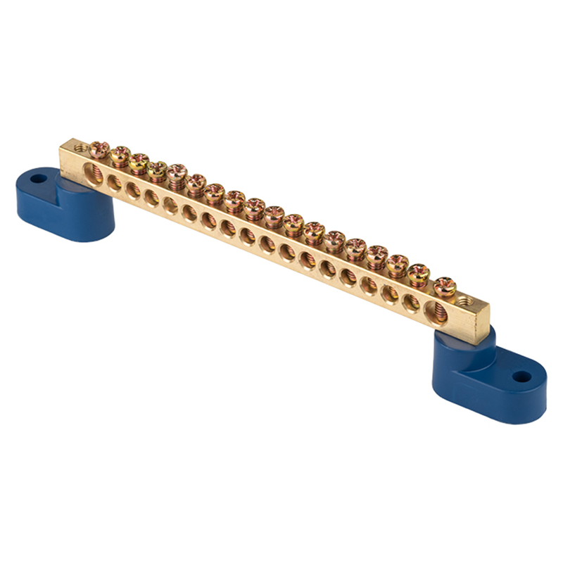 Шина "0" N (8х12мм) 18 отверстий латунь 2 синих угловых изолятора PROxima EKF sn0-125-18-2