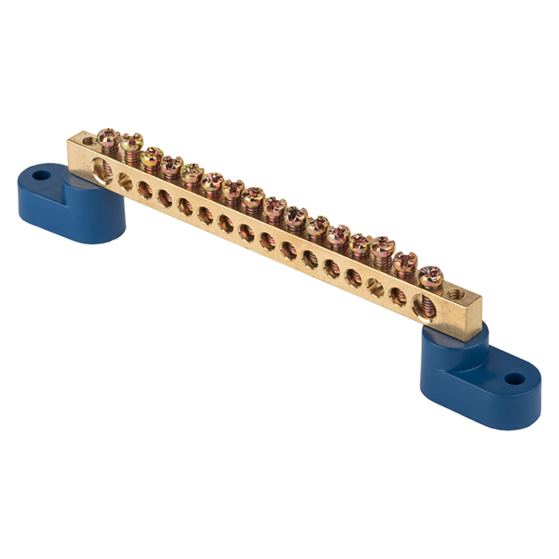 Шина "0" N (8х12мм) 16 отверстий латунь 2 синих угловых изолятора PROxima EKF sn0-125-16-2
