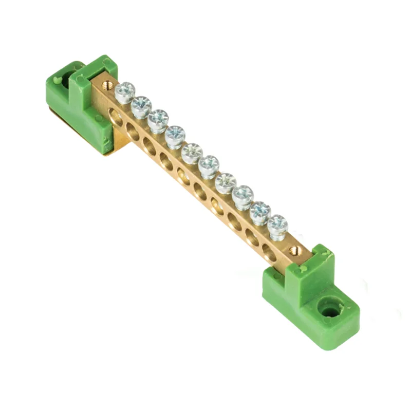 Шина "0" PE 6x9мм 10 отверстий латунь с контактной пластиной 2 зелёных угловых изолятора PROxima EKF