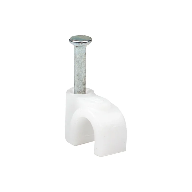 Материал: полипропилен, самозатухающий, без галогенов|Гвоздь: закаленная оцинкованная сталь, не подвержен коррозии|Поставляется в комплекте с уже вставленным гвоздем|На каждой скоб