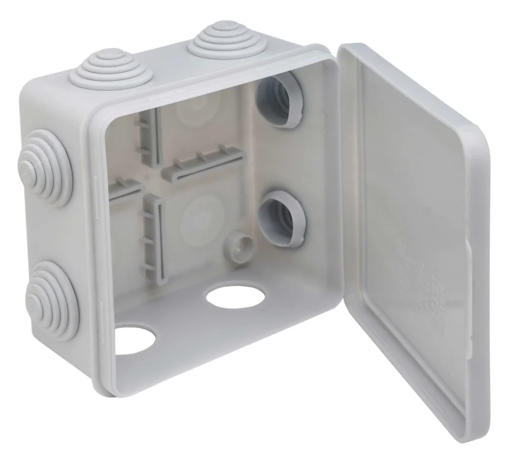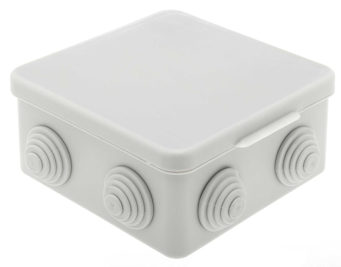 Распределительная (соединительная) коробка предназначена для соединения и (или) протяжки проводов при открытом монтаже проводки, различного исполнения и комплектации. Для монтажа проводов в распределительной коробке предусмотрено восемь отверстий диаметром 23 мм в которые устанавливаются эластичные уплотнительные кольца (муфты). Количество муфт 8 штук. В коробке имеются универсальные посадочные места для клеммных колодок. Крышка коробки откидывается и при этом остаётся на ней, что ускоряет и облегчает процесс монтажа. Цвет серой коробки обозначается цифрами -002. Материал пластик.