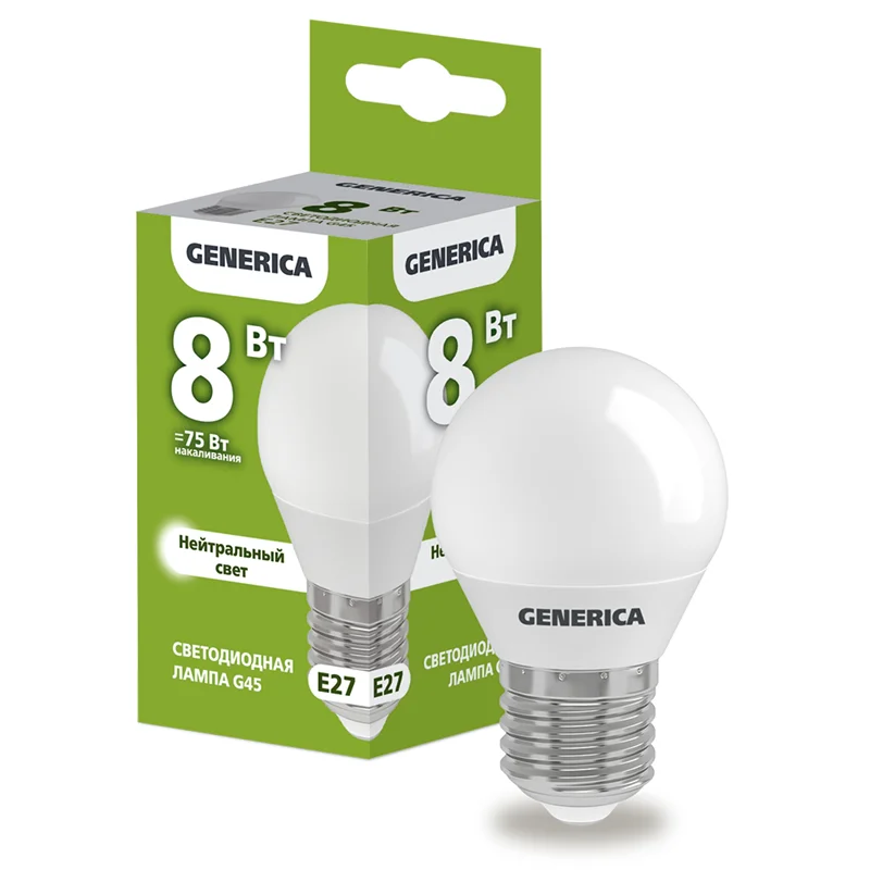 Лампа LED G45 шар 8Вт 230В 4000К E27 GENERICA LL-G45-08-230-40-E27-G