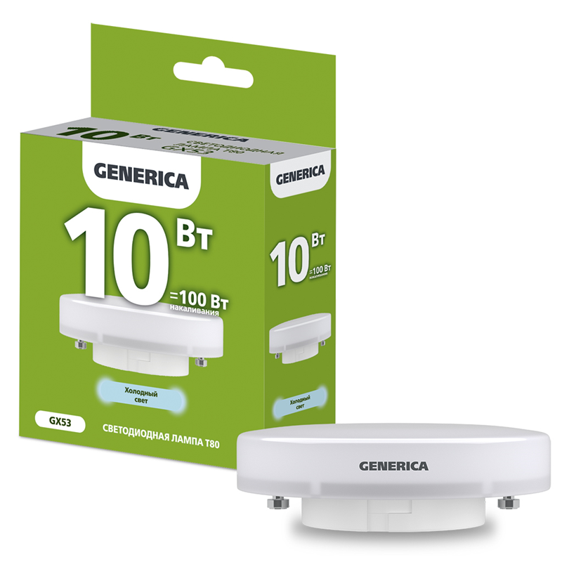 Лампа LED T80 таблетка 10Вт 230В 6500К GX53 GENERICA LL-T80-10-230-65-GX53-G