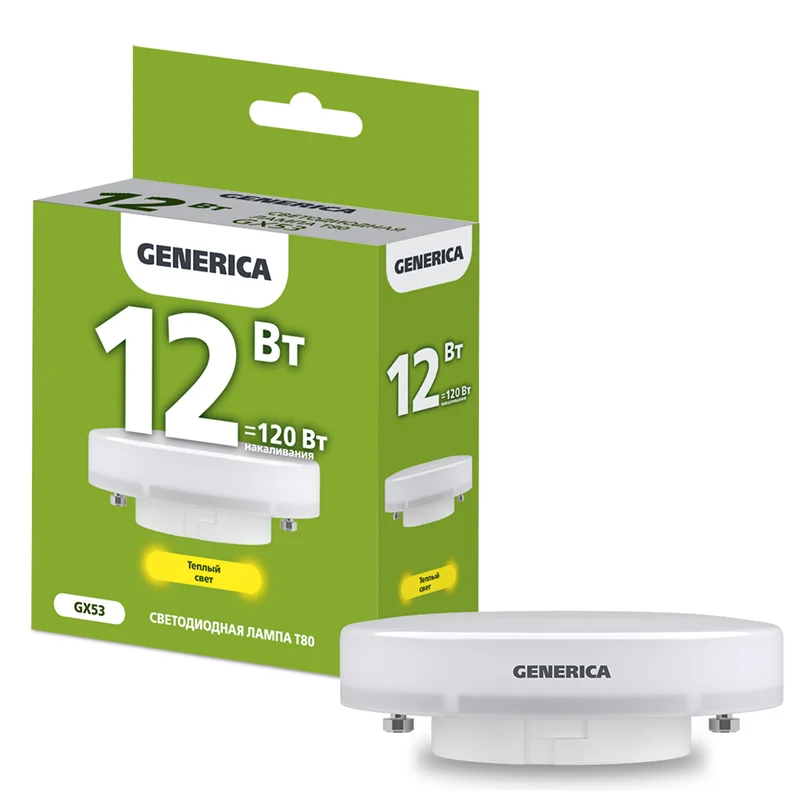 Лампа LED T80 таблетка 12Вт 230В 3000К GX53 GENERICA LL-T80-12-230-30-GX53-G