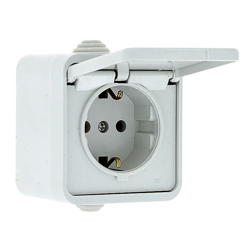 Прага Розетка 1-местная 16А с заземлением с крышкой IP44 белая EKF EKR16-029-10-44
